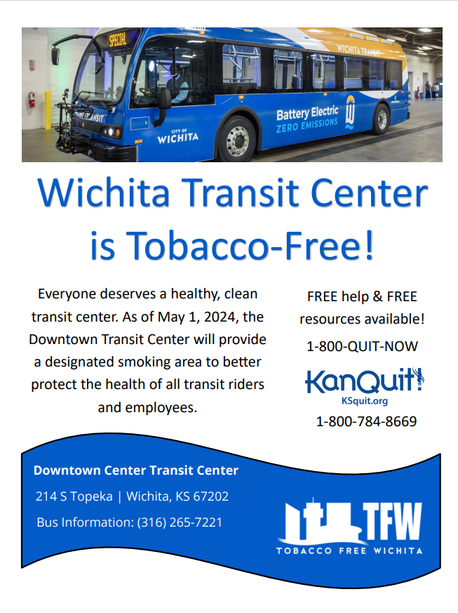 Thank you, Wichita Transit, for placing tobacco-free signage at the transit center! Everyone deserves a healthy, clean transit center. The downtown transit center now has a designated smoking area to better protect the health of all transit riders and employees. Tobacco recovery resources can be found at KSquit.org or by calling 1-800-784-8669.