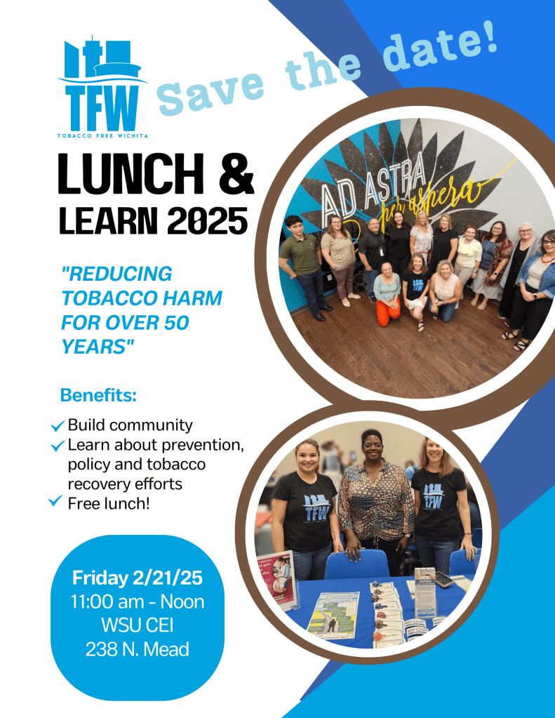 Annual Lunch & Learn Posted on January 3, 2025 by tobaccofreewichita Leave a comment Share this: Click to share on Facebook (Opens in new window) Facebook Click to share on LinkedIn (Opens in new window) LinkedIn Click to email a link to a friend (Opens in new window) Email Click to share on X (Opens in new window) X Related What's Happening?