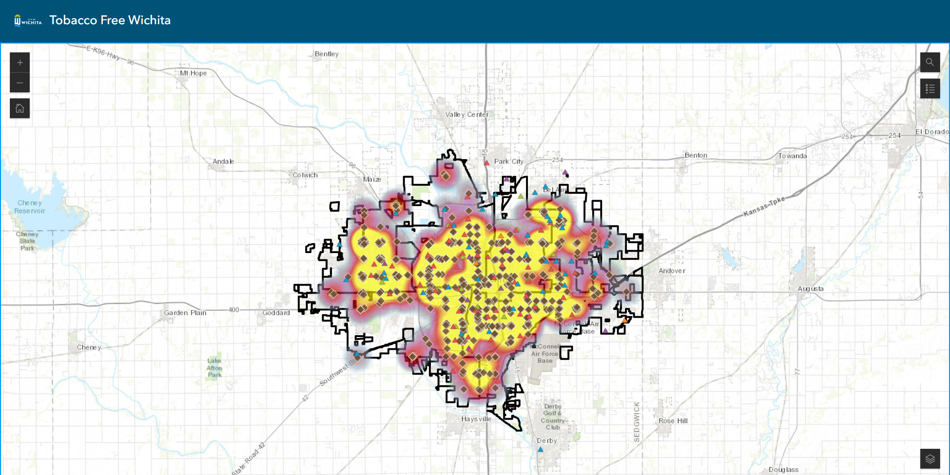 Check out the Tobacco Retailer GIS Heat map here: https://cityofwichita.maps.arcgis.com/apps/instant/basic/index.html?appid=839a1b230ec64a63b82d663db0747913