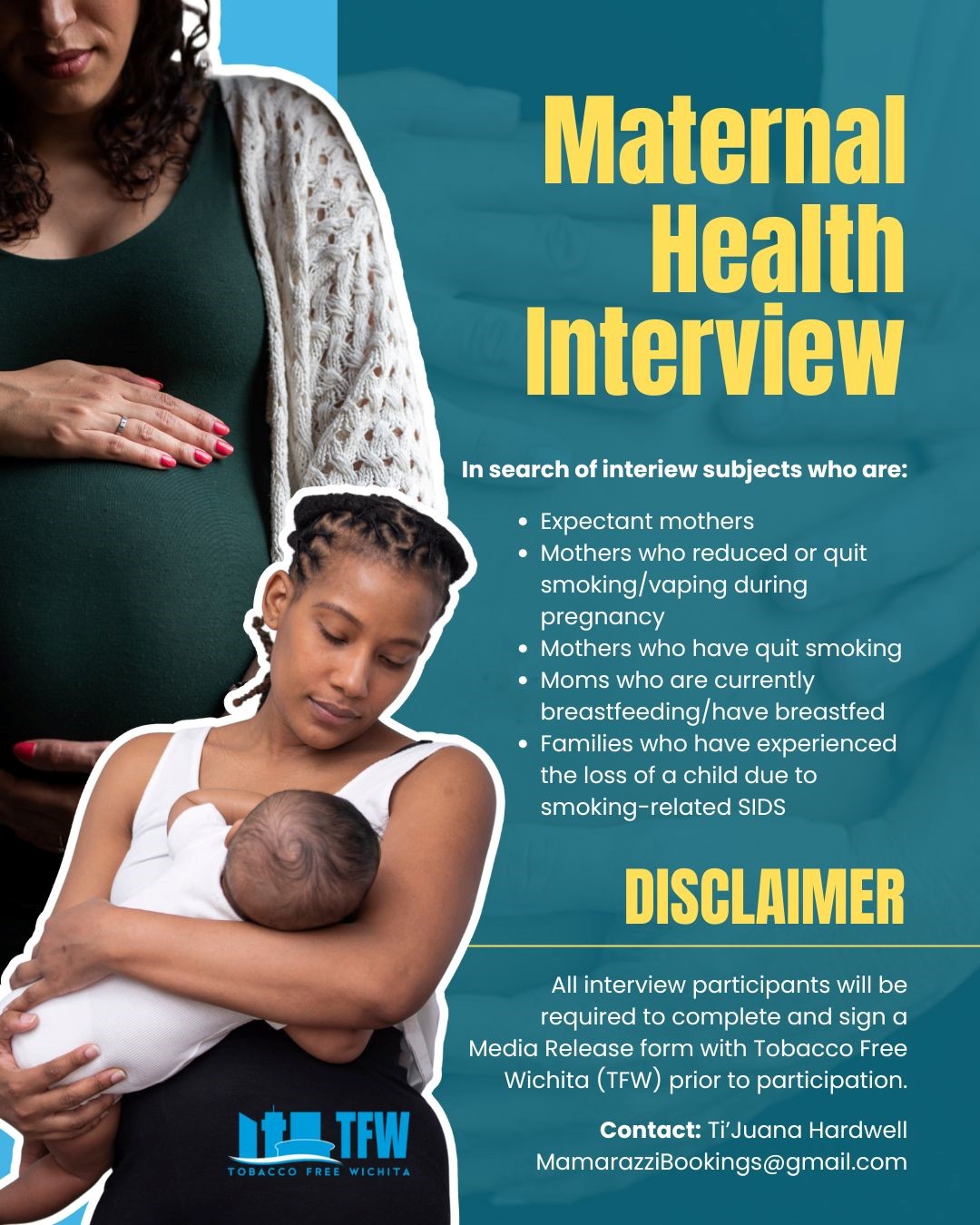Tobacco Free Wichita (TFW) Coalition and Mamarazzi Communications, LLC are now preparing to host Maternal Health interview sessions at the Wichita Foundation’s Elevate – A Community Lab (303 S. Broadway, Suite 100, Wichita, KS 67202).