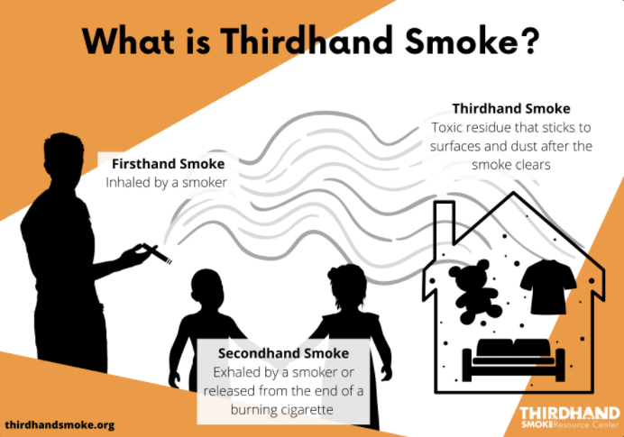 Smoking a cigarette generates two kinds of tobacco smoke: mainstream smoke that is inhaled by the smoker and sidestream smoke from the smoldering cigarette. Secondhand smoke is a combination of the sidestream smoke and the mainstream smoke exhaled by smokers. Thirdhand smoke refers to the secondhand smoke gases and particles that stick to and become embedded in materials and objects, like carpet, walls, furniture, blankets, and toys.